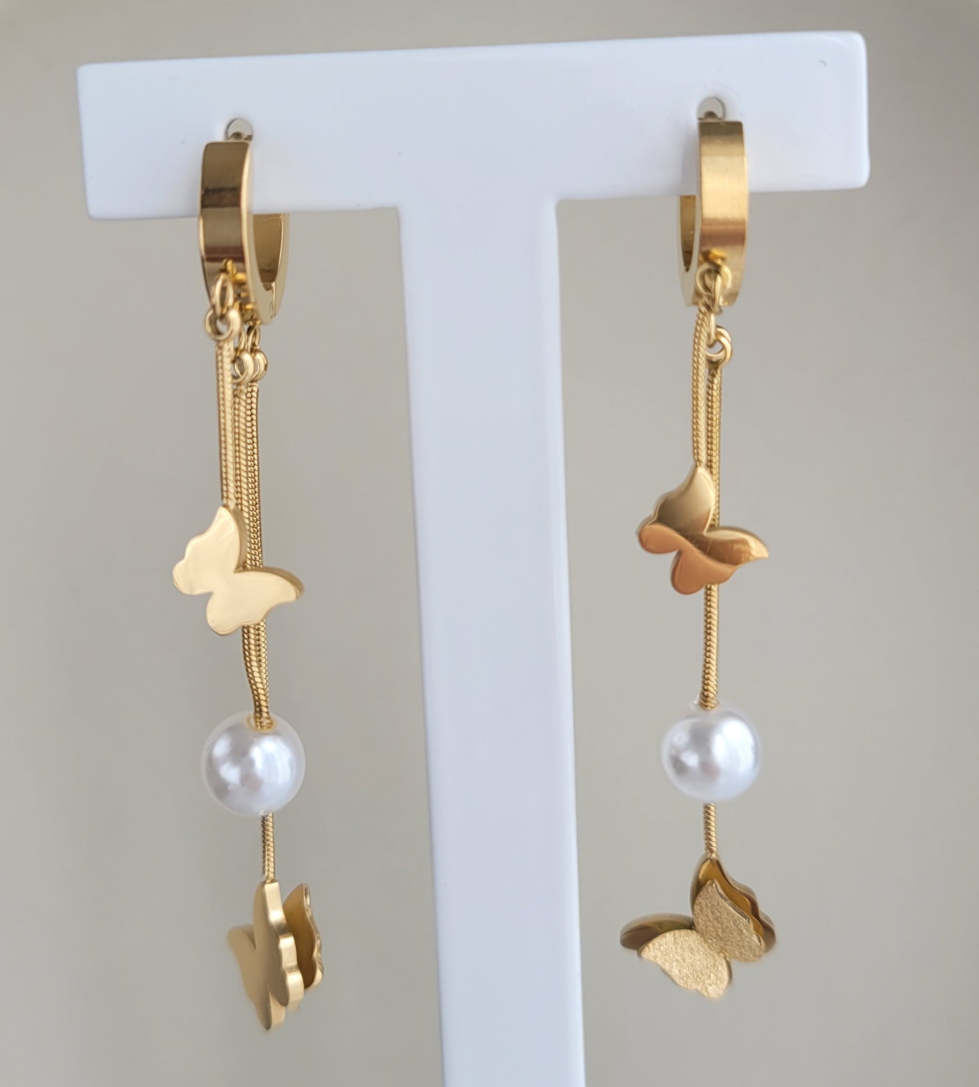 These enchanting earrings combine stylish design with a touch of elegance. With a total size of 6 cm, they are a real eye-catcher. The filigree butterfly pendants symbolize transformation and lightness, while the dangling chain ends in a precious pearl that gives the piece of jewelry additional shine. Made of high-quality 316L stainless steel, the earrings offer both durability and skin-friendliness. Ideal for special occasions or to add an elegant and charming touch to your everyday life.