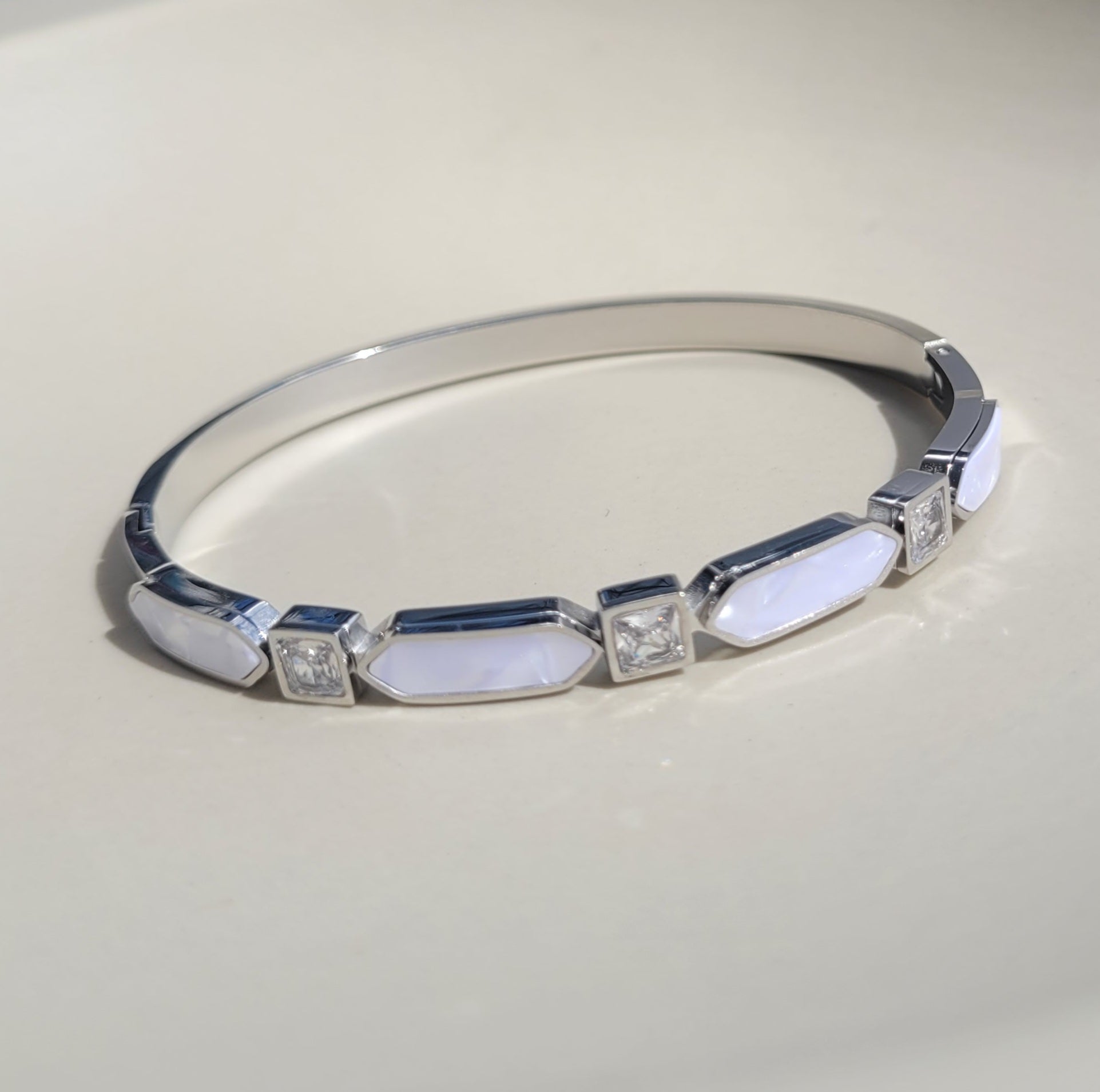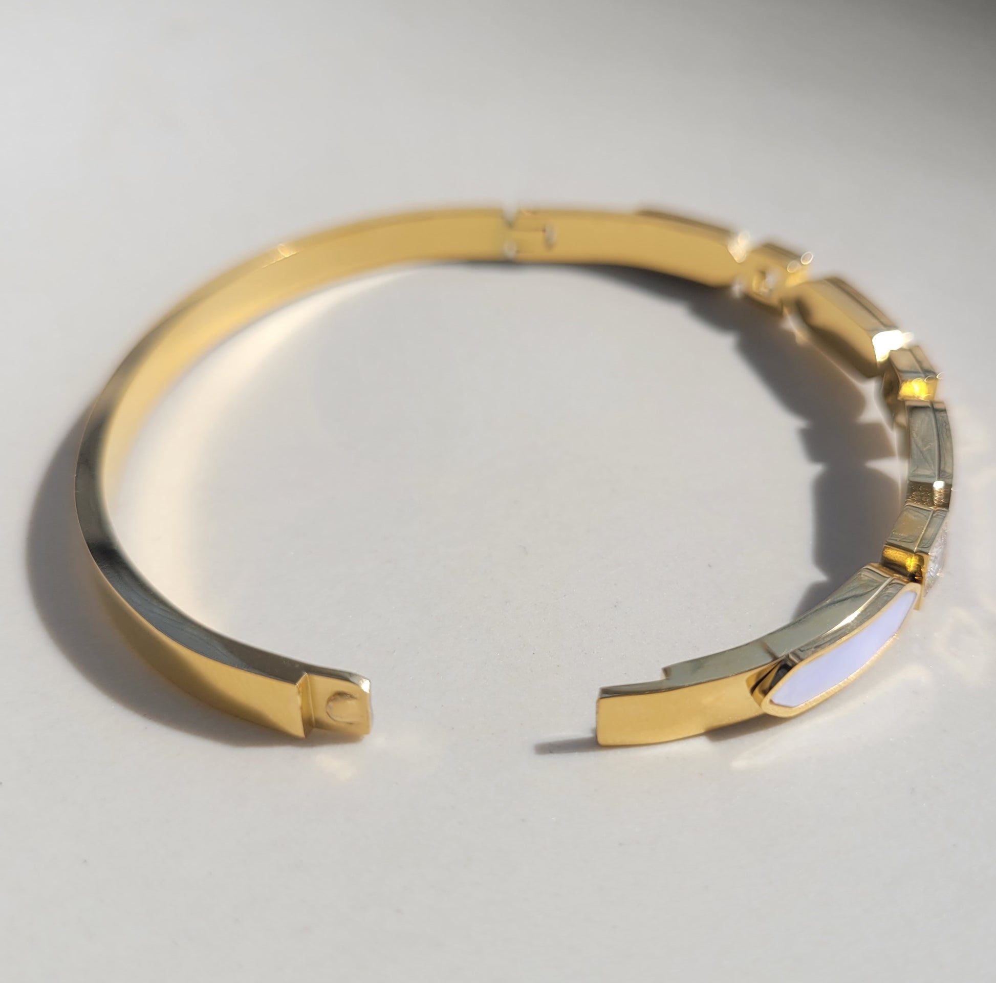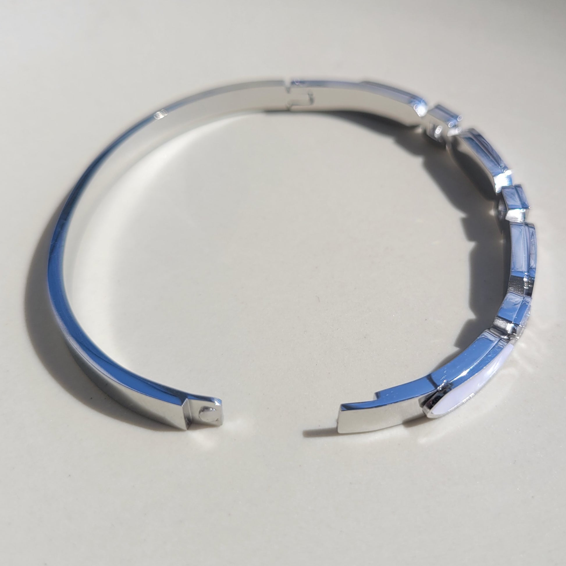 Dieses elegante Armreif mit einer Breite von nur 5 mm nutzt einen praktischen Einrastverschluss, der für sicheren Halt und einfache Handhabung sorgt. Der Verschluss rast zuverlässig in eine Halterung ein, wodurch das Armreif fest sitzt und bequem getragen werden kann. Mit einem Innendurchmesser von 6 cm bietet es eine ideale Passform. Perfekt für den täglichen Gebrauch oder als stilvolles Geschenk – dieses Accessoire vereint Funktionalität mit zeitlosem Design.