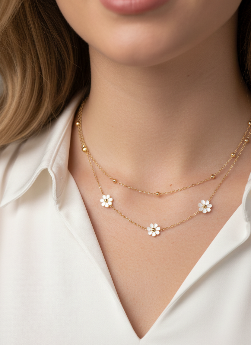 Diese bezaubernde Halskette mit doppelter Lage bringt florale Leichtigkeit in Ihren Look. Die filigranen goldenen Ketten sind mit zarten Blumenanhängern aus Perlmutt verziert – ein Symbol für Eleganz und Frische. Perfekt, um jedes Outfit zu veredeln!